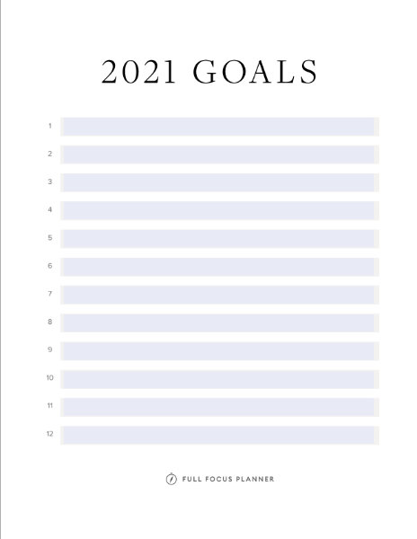 The Fillable Goals Sheet has room for up to 12 annual goals. If youβve identified more than a dozen goals for 2021, choose a few to move to next year. Then, fill in this sheet and keep it in a place youβll encounter several times per week.